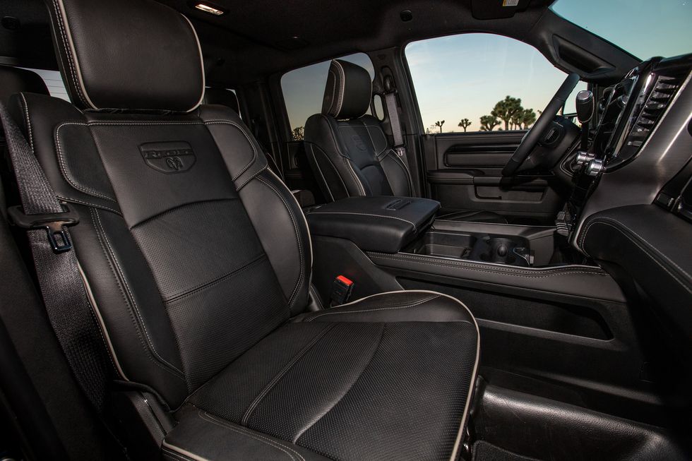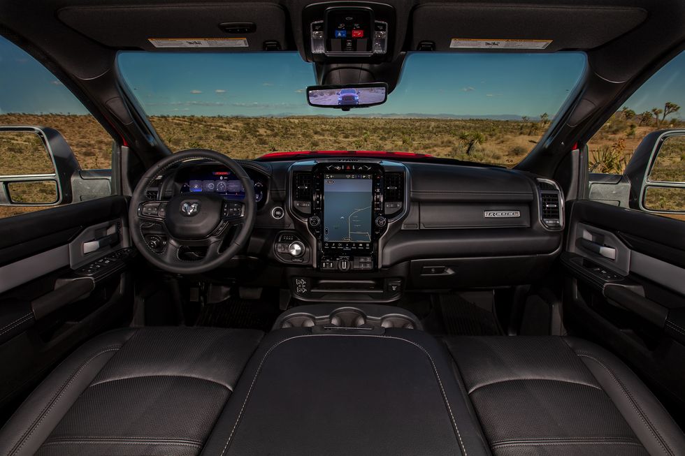 Available interior features in the 2024 RAM 2500 include Eight-way power front seats with two-way power lumbar, Heated front and rear seats, Ventilated front seats, Rear under-seat storage, Dual-zone auto temperature control a Digital rearview mirror with side camera integration and a Heated steering wheel.